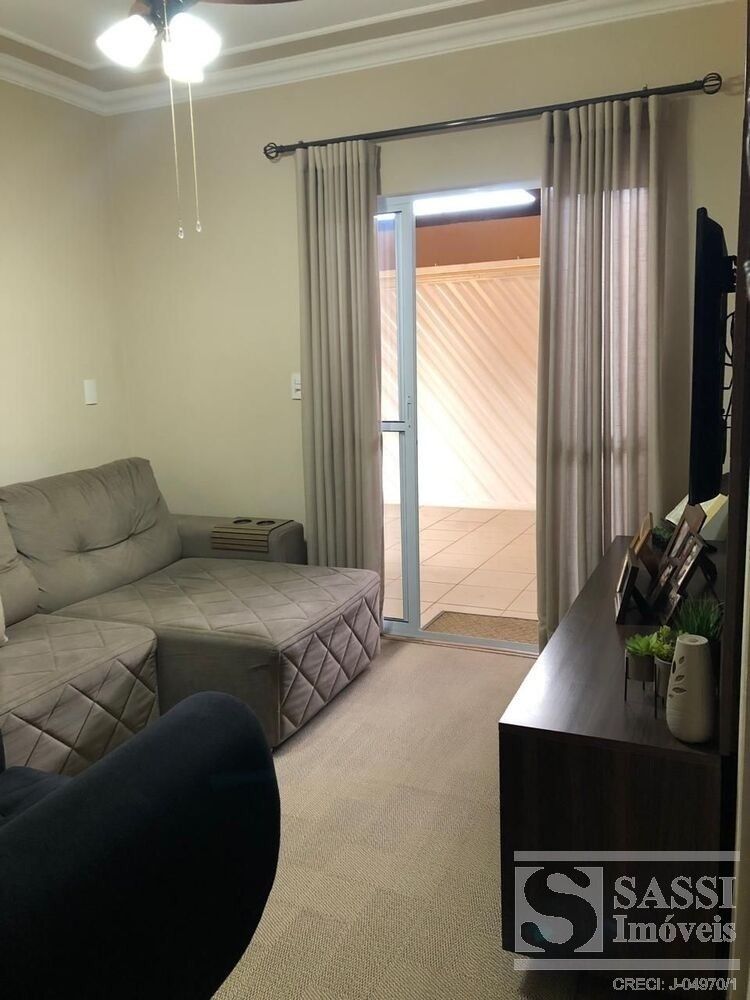 Casa localizada Pq. Abílio Pedro com dois dormitórios, sala de estar equipada com painel de TV, cozinha com planejados, banheiro, área de serviço com armários embutidos, garagem privativa e portão eletrônico.