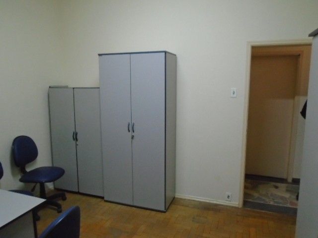 Sala comercial medindo 3,5m² x 5m com ar condicionado e área comum contendo recepção, banheiro e cozinha.Acabamento em piso de taco de madeira e teto laje.