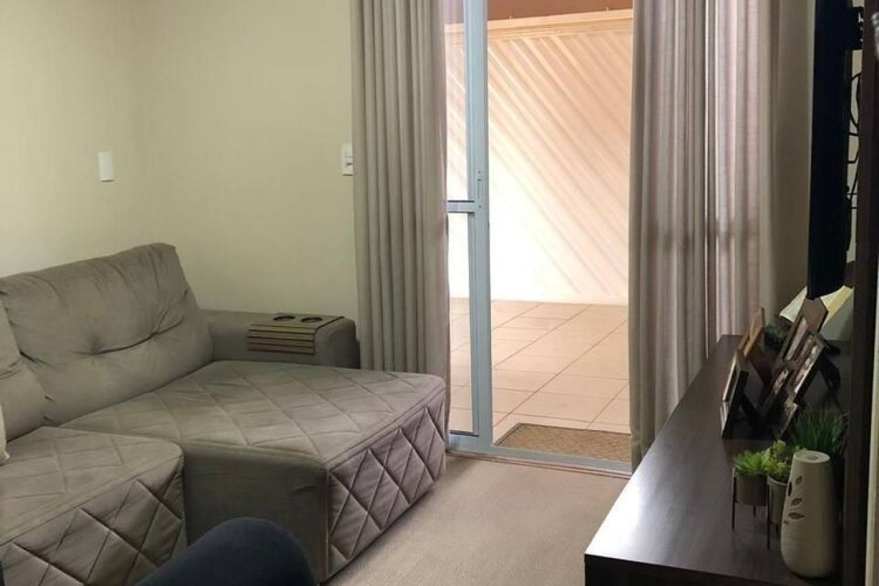 Casa localizada Pq. Abílio Pedro com dois dormitórios, sala de estar equipada com painel de TV, cozinha com planejados, banheiro, área de serviço com armários embutidos, garagem privativa e portão eletrônico.