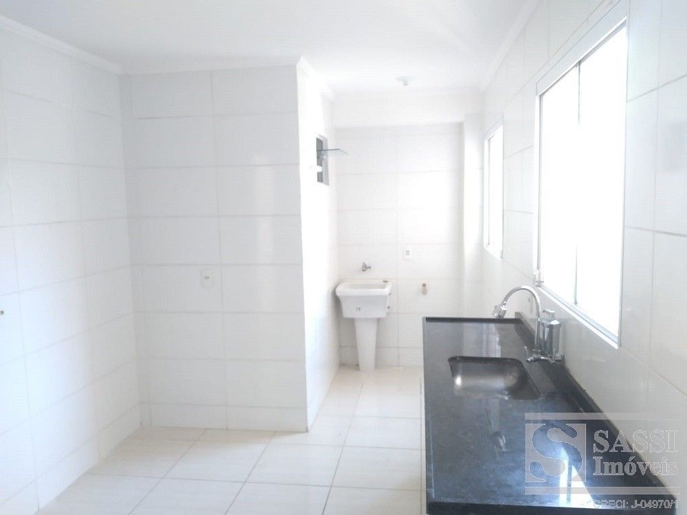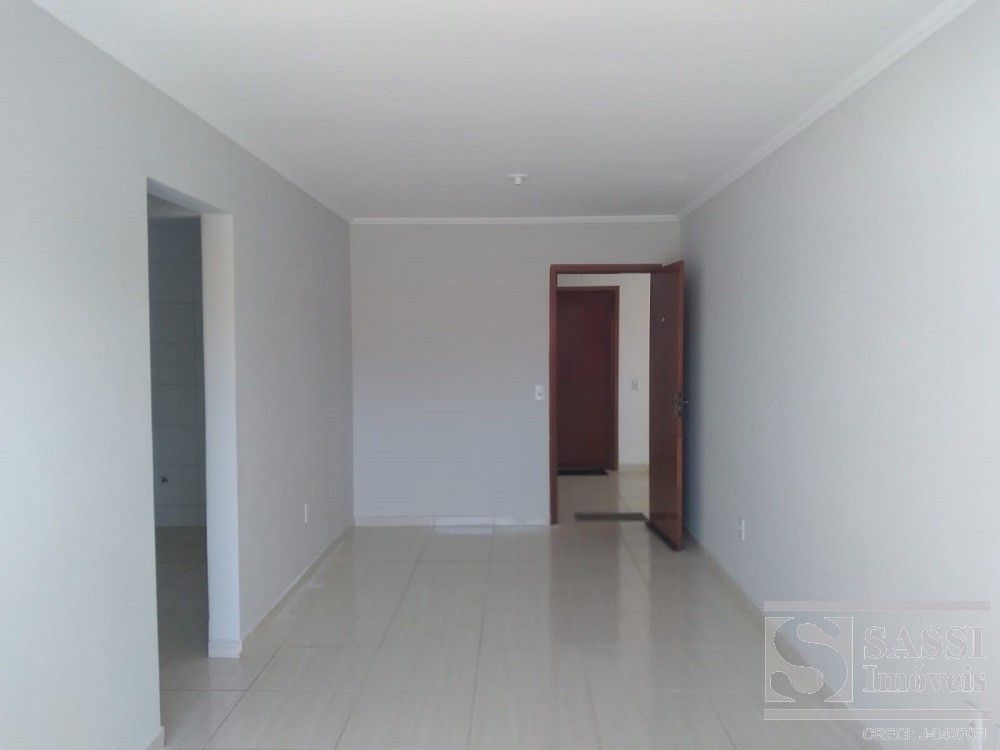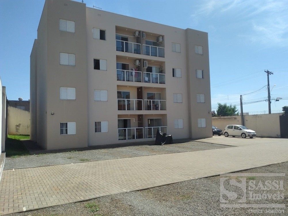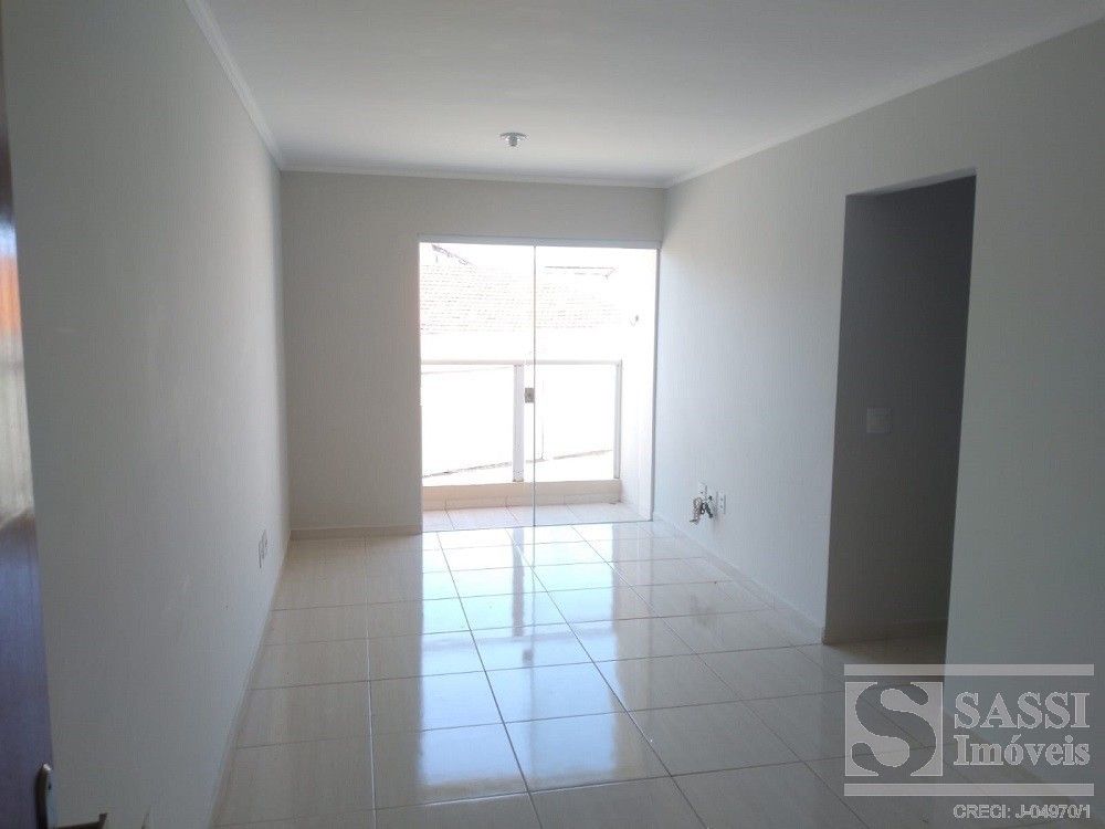 Apartamento a venda com dois dormitórios, sala com sacada, cozinha com gabinete, área de serviço, banheiro com armário e uma vaga de garagem.